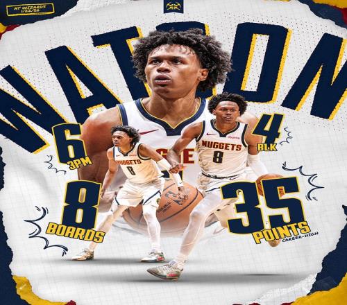 掘金:沃特森35分8板3助2断4帽创生涯新高、穆雷24分4板5助2断、瓦兰丘纳斯16分9板2助、戈登16分5板5助。