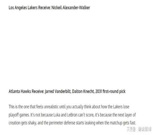 那么湖人如果有机会拿到亚历山大-沃克,送走范德比尔特和克内克特,似乎就显得不值一提了。因为这两名球员,就没什么市场行情,范德比尔特顶多是合格替补轮换,但薪资却有些高了。克内克特则直线下滑,现在根本没什么机会,所以对于老鹰来说,这笔交易方案最大收益,应该就是等着如果2031年湖人竞争力下滑,甚至直接展开重建,那个选秀权顺位会比较高。